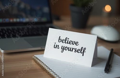 Believe in yourself message on notebook with laptop for business motivation