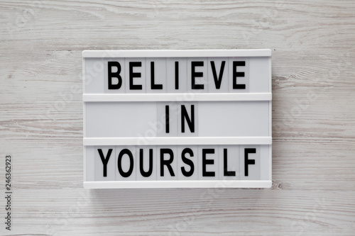 'Believe in yourself' word on modern board on a white wooden surface, top view. From above, flat lay, overhead.
