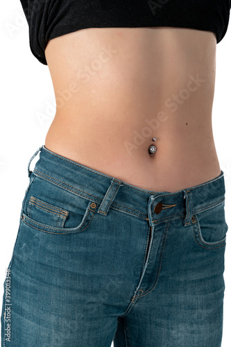Belly button or navel piercing, of young woman wearing jeans isolated on white.