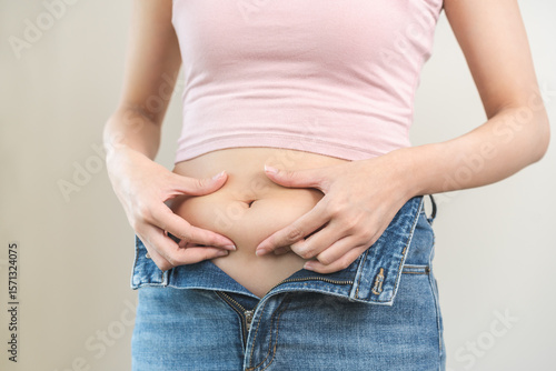 Belly, chubby, obese asian young woman hand holding, pinching excess fat belly with finger and wear tight jeans, show fat abdomen on body, getting loss weight. Diet lifestyle and health care concept.