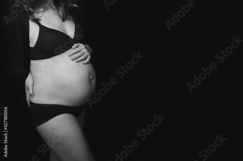 Belly of a pregnant woman in underwear in profile on a dark background, black and white photo