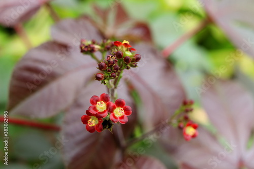 Bellyache bush or Jatropha gossypiifolia blooming on bunch and blur leaves bckground. Another name is Black physicnut, Cotton-leaf physicnut, Cotton-leaf Jatropha.