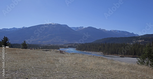 bench by a river and mountains