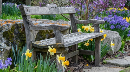 Bench made of wood surrounded by daffodils and assorted purple blooms
