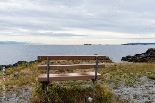 bench on the shore of the bay for relaxation on cloudy day