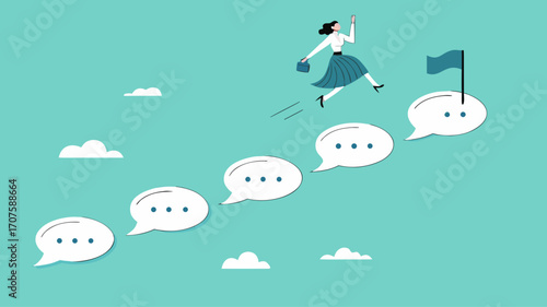 benefit of effective communication in business, communication skills to support career development, effective communication for business growth, businesswoman climbing the ladder of speech bubble