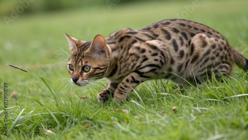 Bengal cat crouched in hunting position grassy field wildlife photography outdoor environment focused viewpoint capturing a predator's stance.