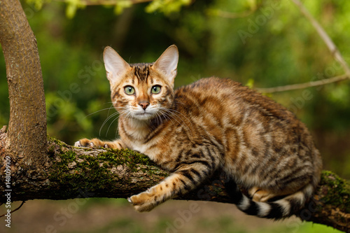 Bengal Cat Hunting outdoor, on branch tree, Nature green background