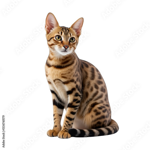 Bengal cat sitting upright on white background, isolated. Posture and intricate fur patterns make it suitable for pet campaigns, educational materials, and cat breed promotions.