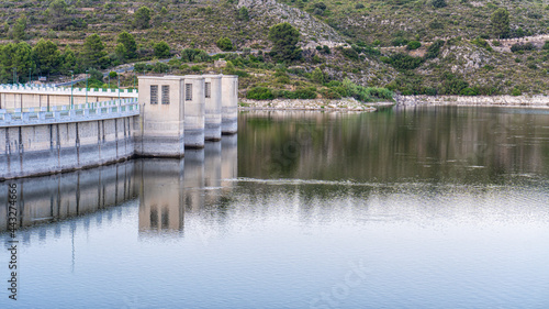 Beniarres's dam at dusk, with some reflections on the water, with a clear sky.