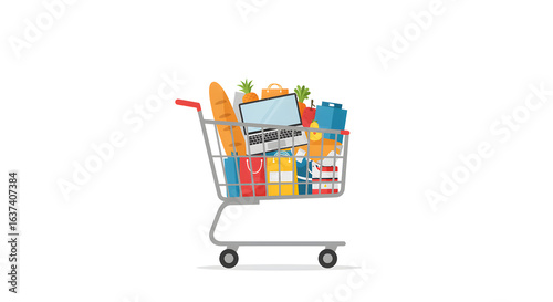 Berbelanja sampai lelah dengan keranjang belanja penuh berisi belanjaan, laptop, dan hadiah, cocok untuk pemasaran ritel, promosi penjualan daring, dan kampanye liburan.