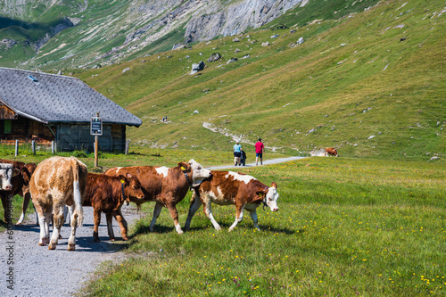 Bern, Switzerland - July 25, 2022 - View of Engstligenalp from the Engstligengrat hiking trail, Swiss Alps, Switzerland