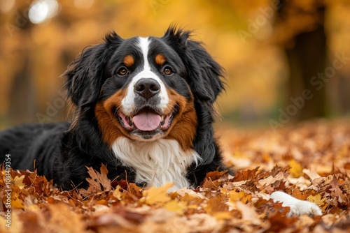 Bernese Mountain Dog Laying in a Pile of Autumn Leaves