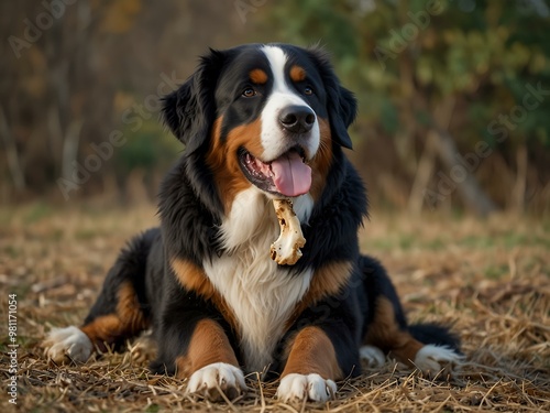Bernese mountain dog with a bone.
