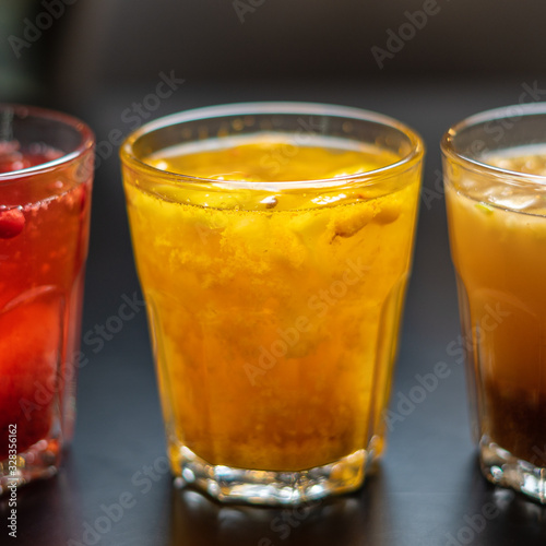 Berry and fruit drinks in glasses close-up.