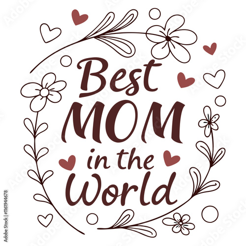 "Best Mom in the World" Text with Heart and Floral Decorations. Perfect for: Mother's Day, Family celebrations