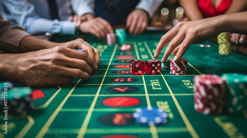 Betting Chips on Craps Table: Hands placing a bet on the craps table, dice ready to be rolled and chips in place.