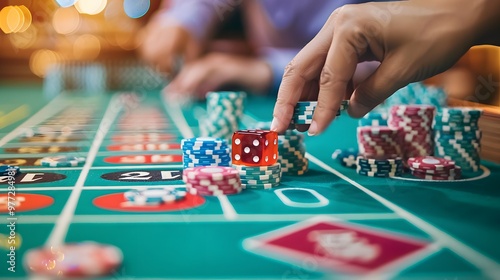 Betting Chips on Craps Table: Hands placing a bet on the craps table, dice ready to be rolled and chips in place.