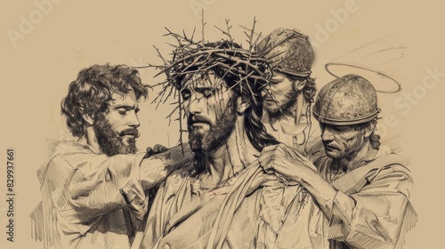 Biblical Illustration: Crowning with Thorns, Soldiers Mock Jesus, Painful Expression, Beige Background, Copyspace
