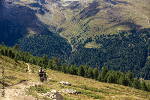 Bicycle path in the mountains. Cycling trip on MTB mountain bikes.