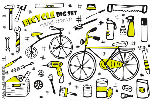 Bicycle repair tools and accessories big set. Two beautiful bicycles hand-drawn isolated on a white background. Image