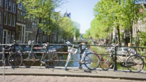 Bicycles parked against a railing on a sunny day with a defocused backdrop of amsterdam's vibrant canals and green trees.