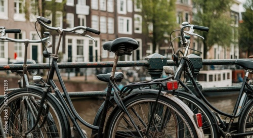 Bicycles parked along a canal in Amsterdam, showcasing urban lifestyle