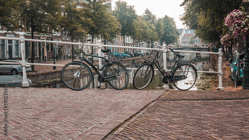 Bicycles parked on a bridge and typical Dutch houses in Leiden, Netherlands