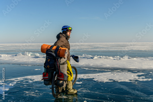 Bicyclist on the coast of Baikal lake in winter. Buguldeika, Irkutsk Region, Russia