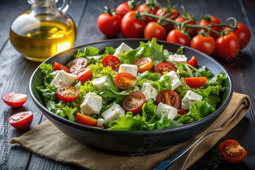 Big black bowl, healthy eating: creamy goat cheese salad, simple, delicious, satisfying.