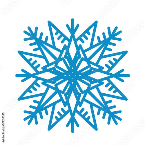 Big blue snowflake icon on white background. Single symmetric flat illustration