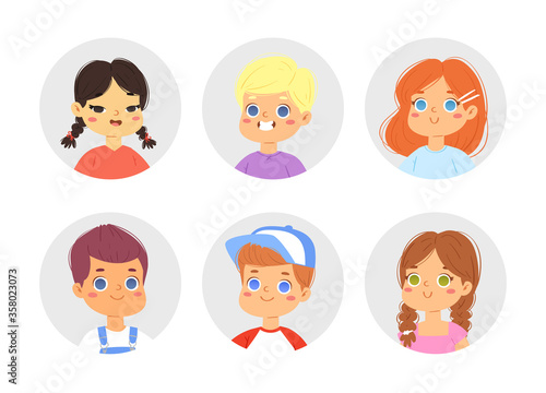 Big bundle set of different multinational children faces. Happy cute boy and girl avatars. Vector illustration of teenagers or pupil kids heads isolated on white background, pic icons for online game
