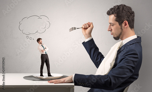Big businessman want to eat small man with cloud messages above his head
