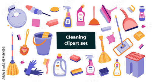 Big cartoon set with cleansing supplies clipart in trendy bright colors. Hand drawn collection to clean up dirt, grime, dust, garbage, mess in the apartment. Lovely housekeeping devices and cleansers.