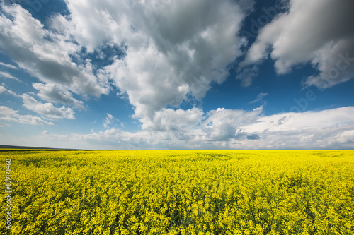 Big cloud on blue sky over yellow rape field