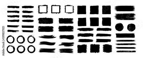 Big collection of black grunge elements, brush stroke, ink splash and grungy decoration. Dirty artistic design elements, frames, lines, circle and square shapes isolated. vector illustration