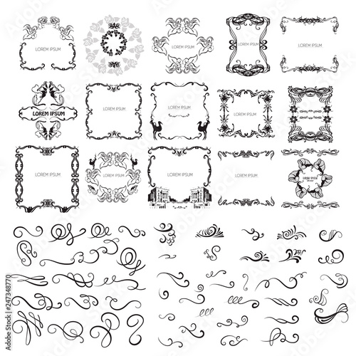Big collection of hand drawn frame swirls and curles. Unique romantic design element for wedding cards, in invitations , save the date cards , poster and banner