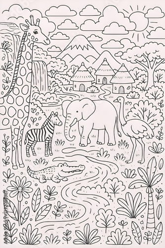 Big coloring page with African animals, tiger, elephant, koala, crocodile, lion, flamingo, Zebra, Elephant, Giraffe