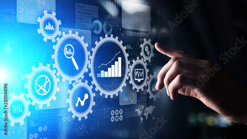 Big Data analysis, Business process analytics diagrams with gears and icons on virtual screen.
