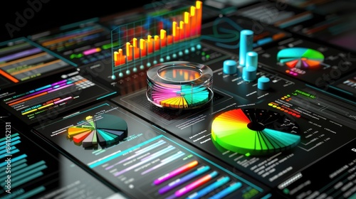 Big data analytics report. Infographic with graph and chart on abstract background. Distribution of data by business categories