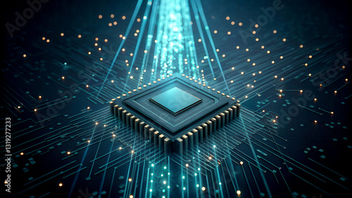 Big data analytics scalable concept. Futuristic microchip surrounded by glowing data streams and particles.