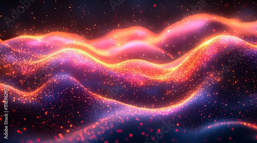Big data visualization is represented by flowing lines of colorful dots and stripes, forming an abstract representation of digital information flow on a dark background