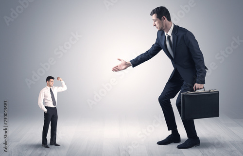 Big debutant young businessman scared of small strong businessman