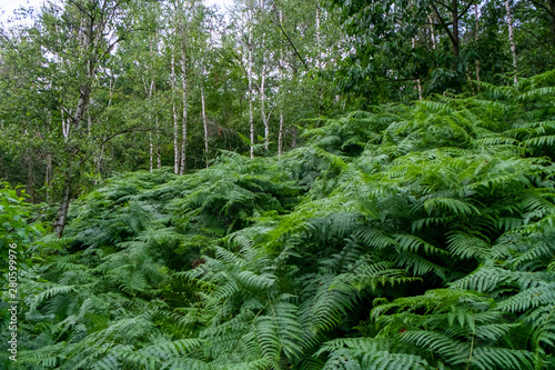 Big fern leafs in the foreground against a background of a green forest under a blue sky
