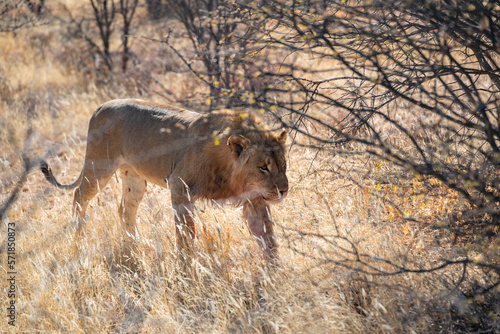 Big lion lying on savannah grass. Landscape with characteristic trees on the plain and hills in the background