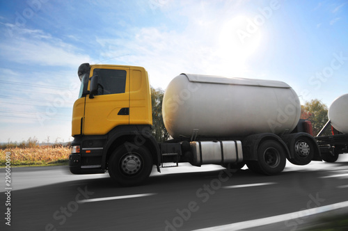 Big metal fuel tanker truck shipping fuel on the countryside road in motion against sky with bright sun