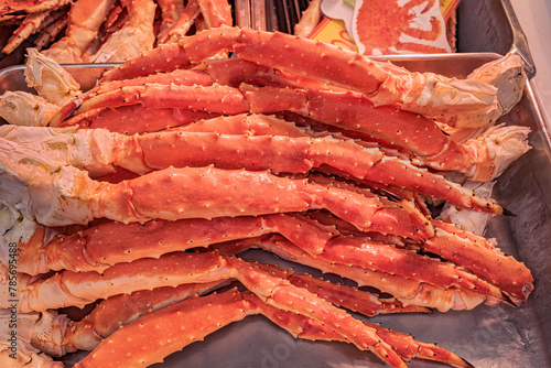 Big pile of crab legs in a market. Luxurious heap of snow crab legs.
