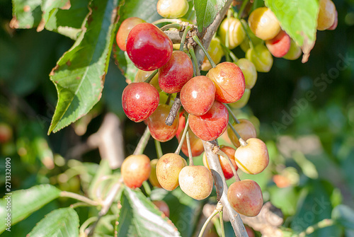 Big red cherries with leaves and stalks. Good harvest of juicy ripe cherries. Cluster of ripe cherries on cherry tree. Fresh and healthy fruit. Cherry orchard.