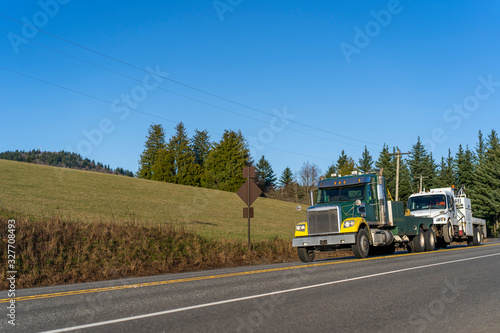 Big rig powerful tow semi truck towing broken semi truck driving to shop for repair.
