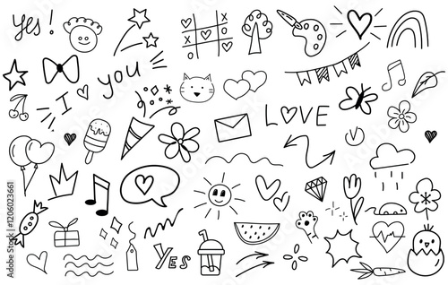 Big set of cartoon doodle hand drawn elements. Line art. Crowns, hearts, stars, flowers, sparkles, arrows, lightnings, smiley, signs and other funny design elements іsolated on white background.